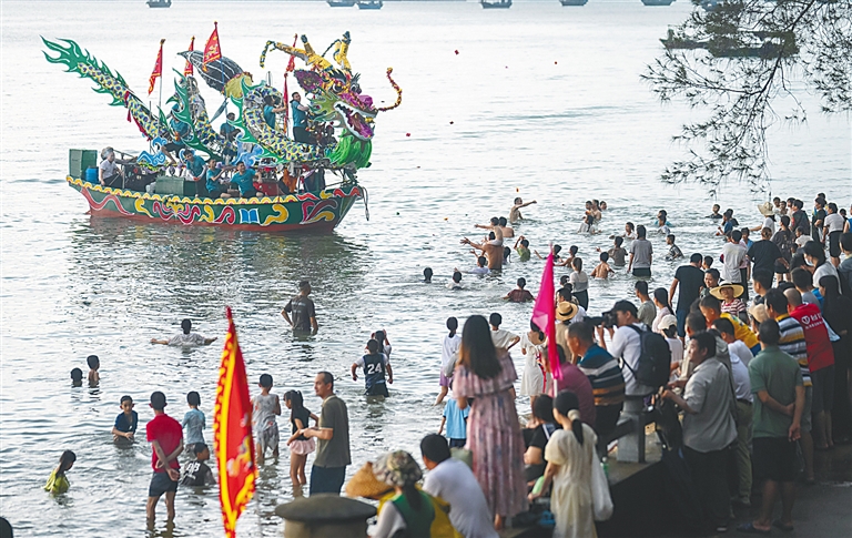 6月10日,在儋州市光村镇泊潮村,龙舟上的村民向岸边的观众送去祝福。海南日报记者 李天平 摄