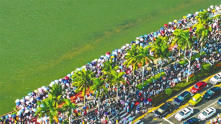 6月10日,在海口市海甸河钟楼附近,观看龙舟赛的市民游客。 海南日报记者 张茂 摄