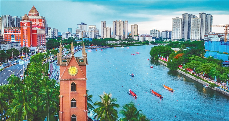 6月10日下午,海口海甸河上水花四溅、鼓声阵阵。来自海口、三亚、儋州等地的12支龙舟队,在海甸河上劈波斩浪,各支龙舟你追我赶,奋力向前。阔别20年,海口市民又在端午节看到龙舟赛了。