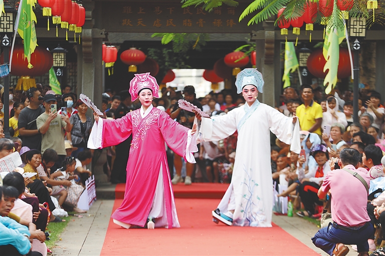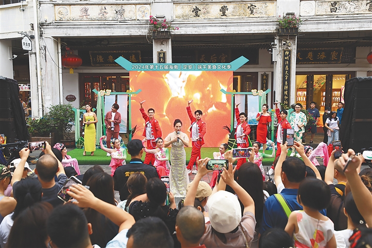 这般热闹的景象在定安很是常见。2024年第十五届海南(定安)端午美食文化季期间,定安举办3场琼剧嘉年华,吸引数万人现场观看,直播累计约32.96万人次观看,受到戏迷们的一致好评。