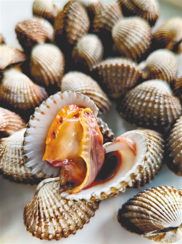 演丰泥蚶(血蛤)在滚沸的开水中烫几秒,即可捞起,掰开生吃。李子兄弟供图